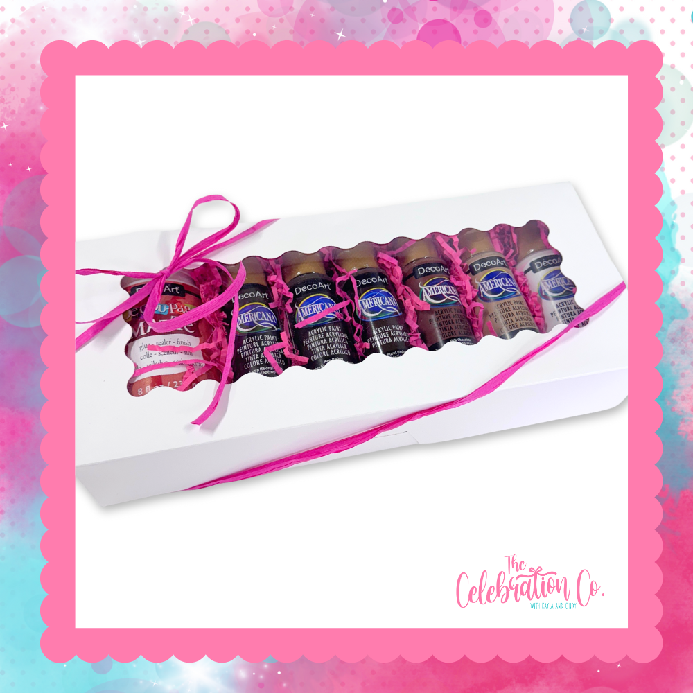 This neutral set of six acrylic paints and one bottle of Decou-Page Glue is perfect for any artist, beginner or experienced. These neutral-colored paints are Kayla's favorites for distressing, adding a vintage flair, or creating versatile neutral backgrounds in her crafting projects.