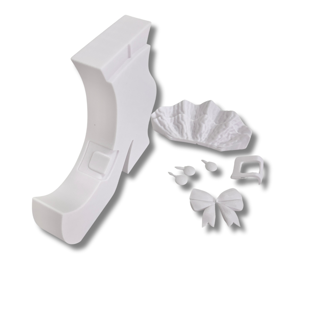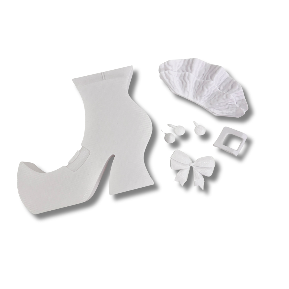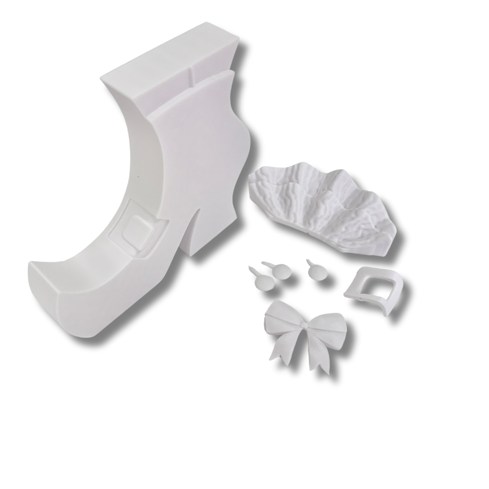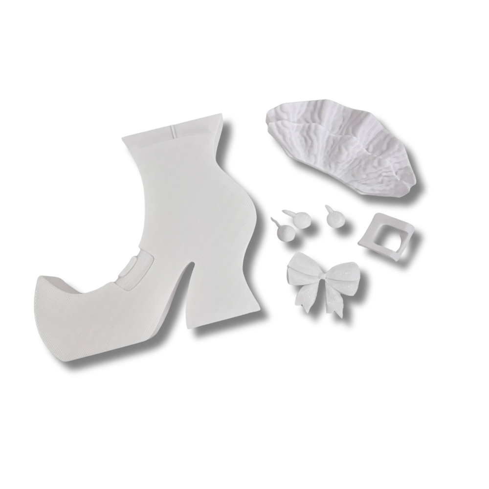 ⚙️ Pieces Included: Boot base, ruffled cuff, bow, buckle, and three buttons